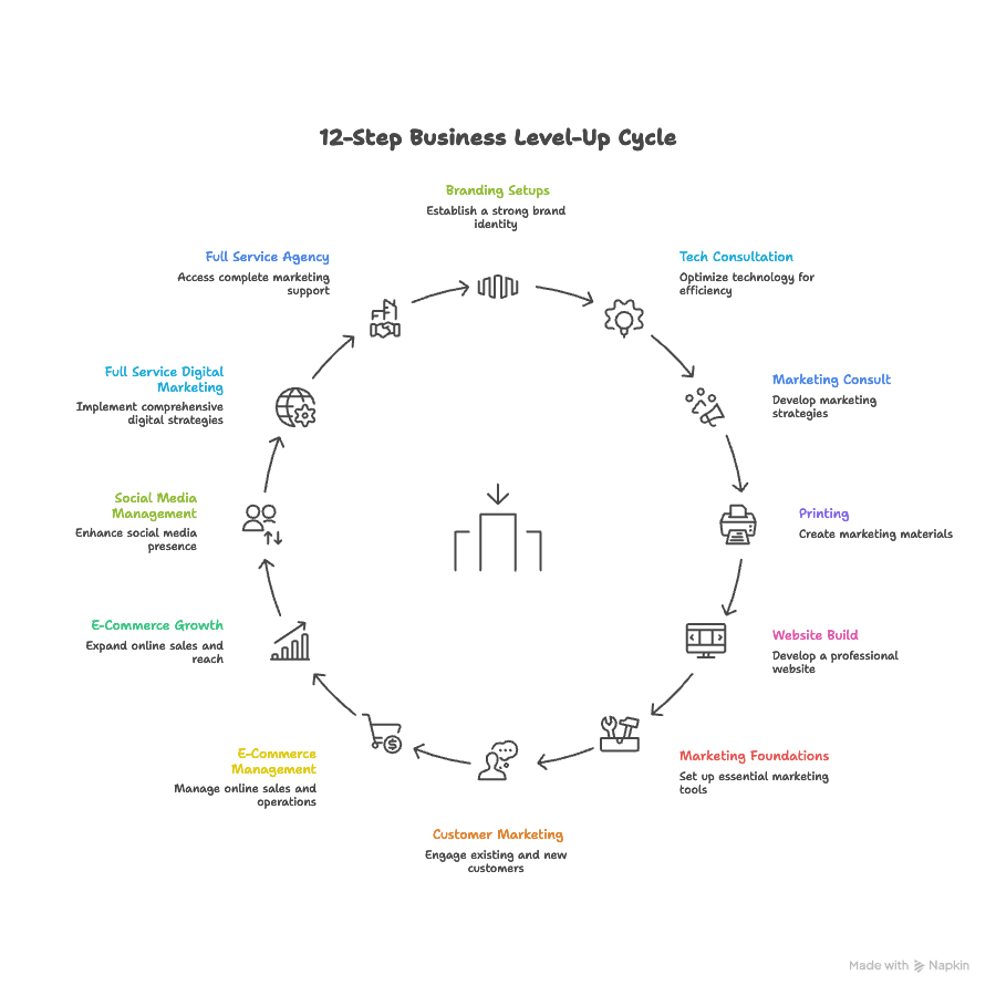Each Marketing piece on its own is a major step and will help you level-up your marketing and sales conversion game, but if you want to really crush your goals and wave to your competition in the rear-view mirror work with us to get through all 12 sections.